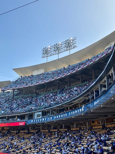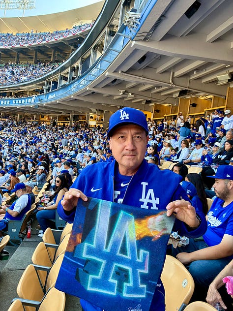 The rally was a blast. I ate a Dodger dog for breakfast. I watched adorable elderly Japanese ladies in Ohtani jerseys pose for photos. The stadium was a sea of blue and white. Manny Mota sat two rows in front of us. I cracked up when Ice Cube drove his lowrider into the stadium and one of Clayton Kershaw’s kids went tearing after it, only to be chased down by his mom, panicked that her son was going to get mowed down by Ice Cubs in front 46,000 people. (The job of being a mom never stops.) I got emotional when Yamamoto addressed the crowd without his interpreter. His first words? “Buenas tardes.”