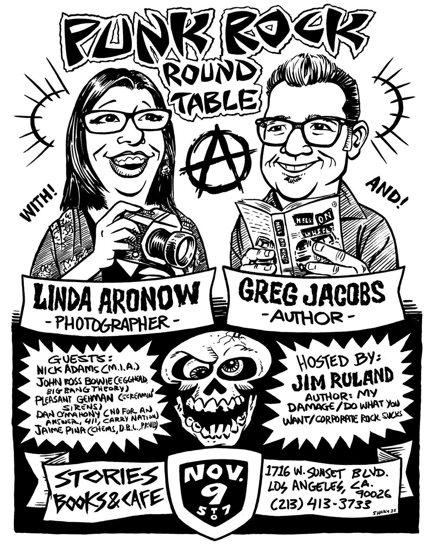 I’m going to host an event in LA on Sunday to celebrate two books: Hell on Wheels by Greg Jacobs and Punk and Other 4 Letter Words by Linda Aronow. We will be joined by Nick Adams, John Ross Bowie, Pleasant Gehman, Dan O’Mahony and Jaime Pina. There will be no tables and if there were they wouldn’t be round, but you get the idea. If you’re in LA on this Sunday, you don’t want to miss this one…