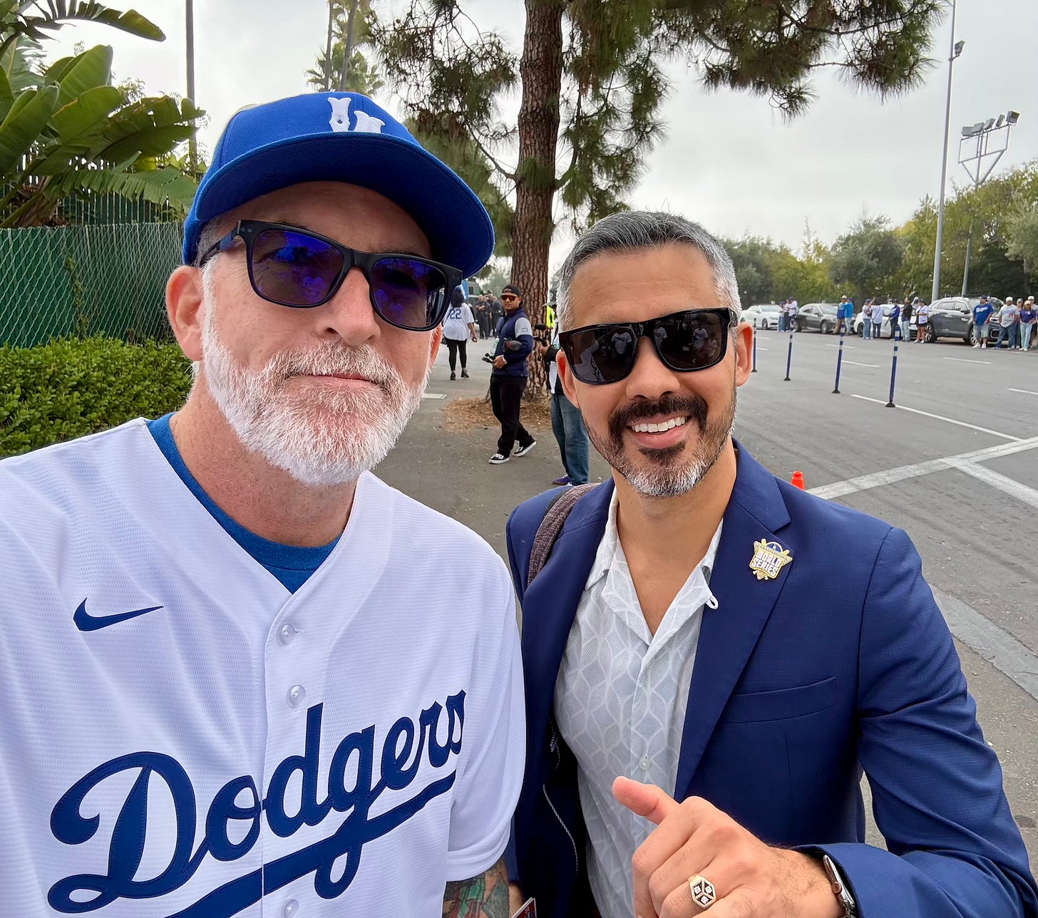 So when my brother-in-law invited me to the rally at Dodger Stadium on Monday to celebrate the victory, I jumped at the opportunity, even though it meant getting up before dawn and arriving at the stadium three hours early. I knew I’d made the right move when I bumped into this guy.